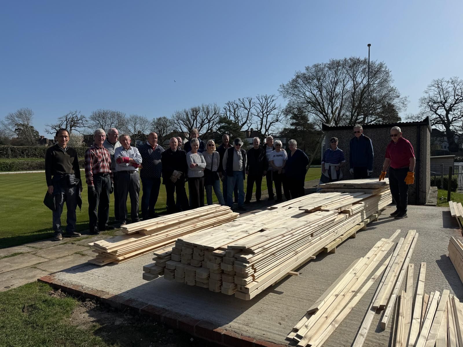 An army of volunteers from the club turned out to transfer a lorryload of timber for the construction of the club's new greenside cabin from Auriol Park's car park up to the prepared site of the base of the new building, under the guidance of club member James Rayne.